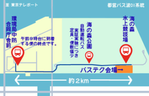 アクセス ★りんかい線「東京テレポート駅」、ゆりかもめ「東京国際クルーズターミナル駅」「テレコムセンター駅」から、都営バス波01(NM01)系統で終点「海の森水上競技場」下車(毎時1本、所要22分)